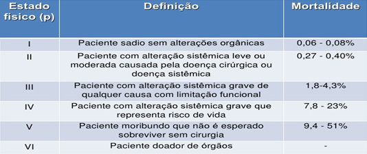 A avaliação do risco cirúrgico do paciente é importante para o planejamento da anestesia de forma a dar a maior segurança possível ao procedimento. Na medicina humana e usada a Classificação do estado físico de acordo com a escala da ASA (American Society of Anesthesiologists). Na veterinária ainda não houve uma padronização de classificação, sendo a ASA adotada e adaptada aos nossos pacientes.